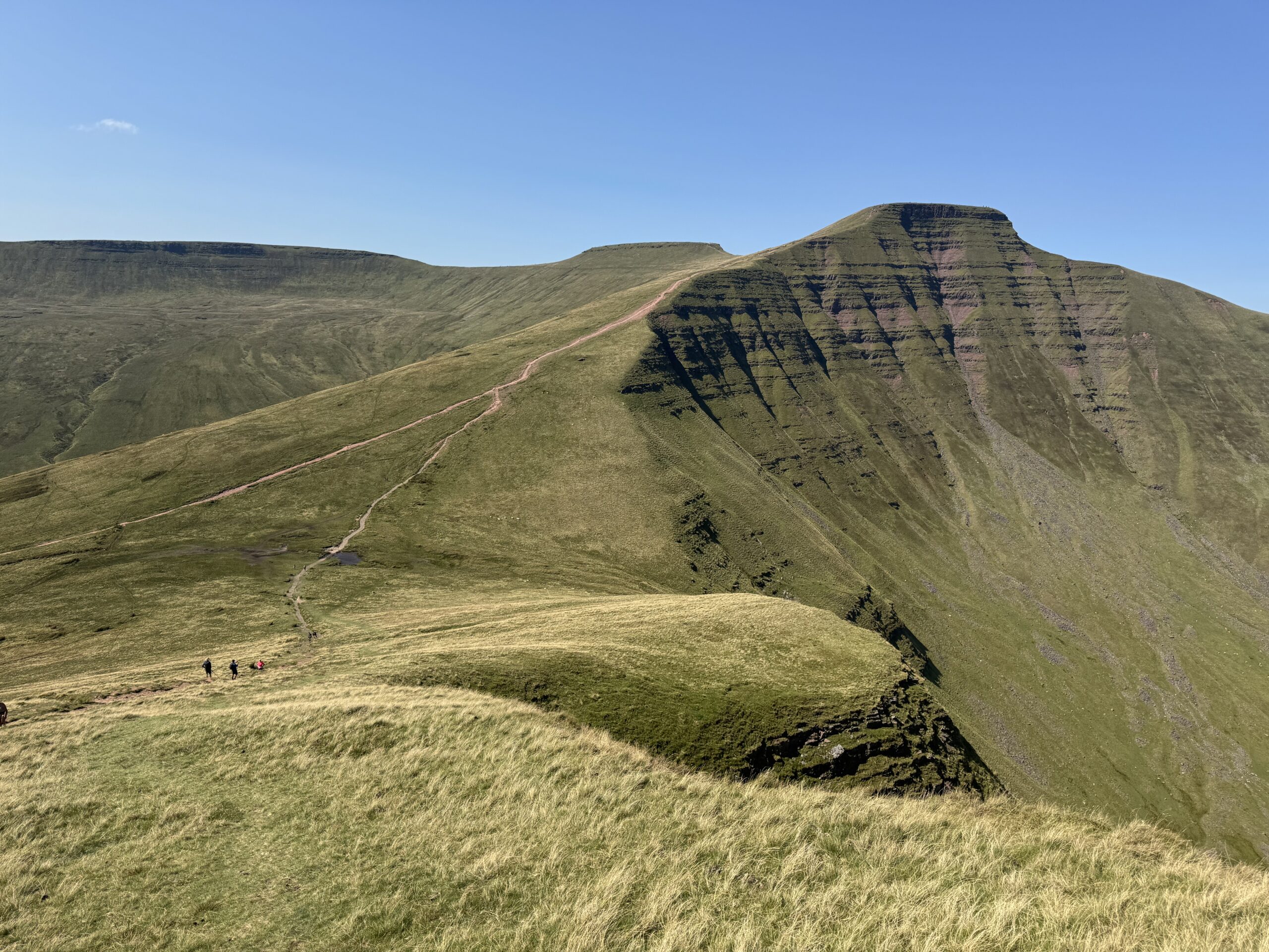 The most popular route starts from Pont ar Daf car park on the A470, south of Brecon. It is a well maintained path around 4.5 miles return with around 400 metres of ascent. On a clear February morning the light hitting the flat topped peak and its neighbour Corn Du at 873m is extraordinary. Pale, clean, almost Nordic in character. The views on a clear day stretch south across the valleys to the Bristol Channel and north deep into mid Wales.